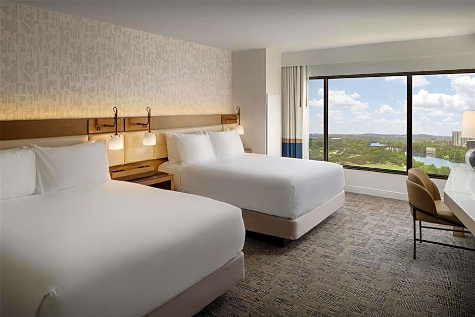This air conditioned queen room features a 55-inch TV, a separate work area with an over-sized desk and a view that overlooks Lady Bird Lake.